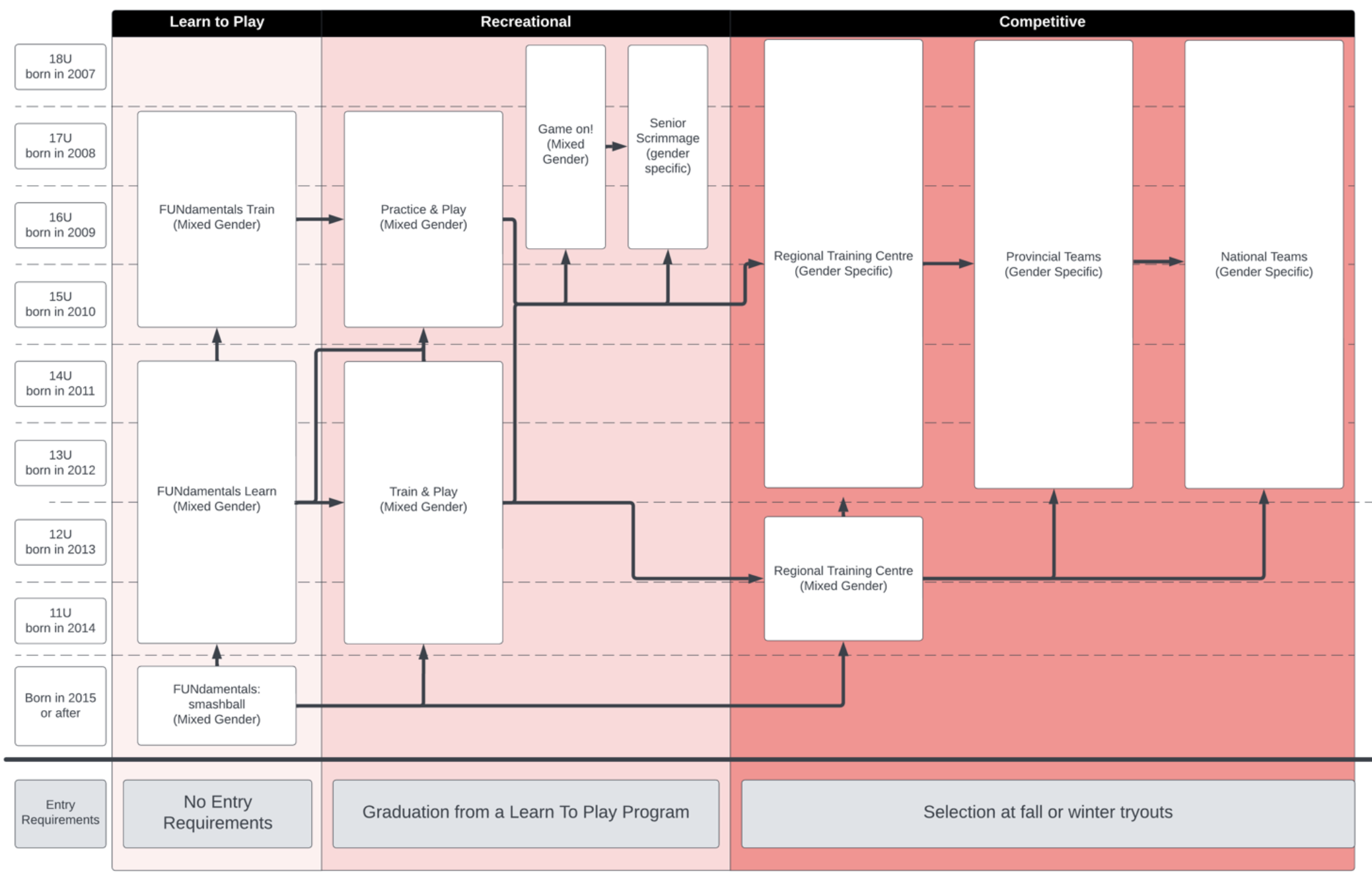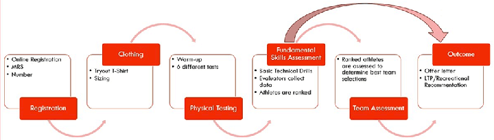 The tryout process consists of 6 steps as shown in the graphic below. All athletes who are interested in playing in a competitive program (National, Provincial & Regional) should sign up for our tryouts at their age group and preferred gender. At the tryouts, athletes will be evaluated by experienced evaluators. This year, tryouts run from September 6th to September 18th, 2024. Players are expected to attend all sessions for their age group.